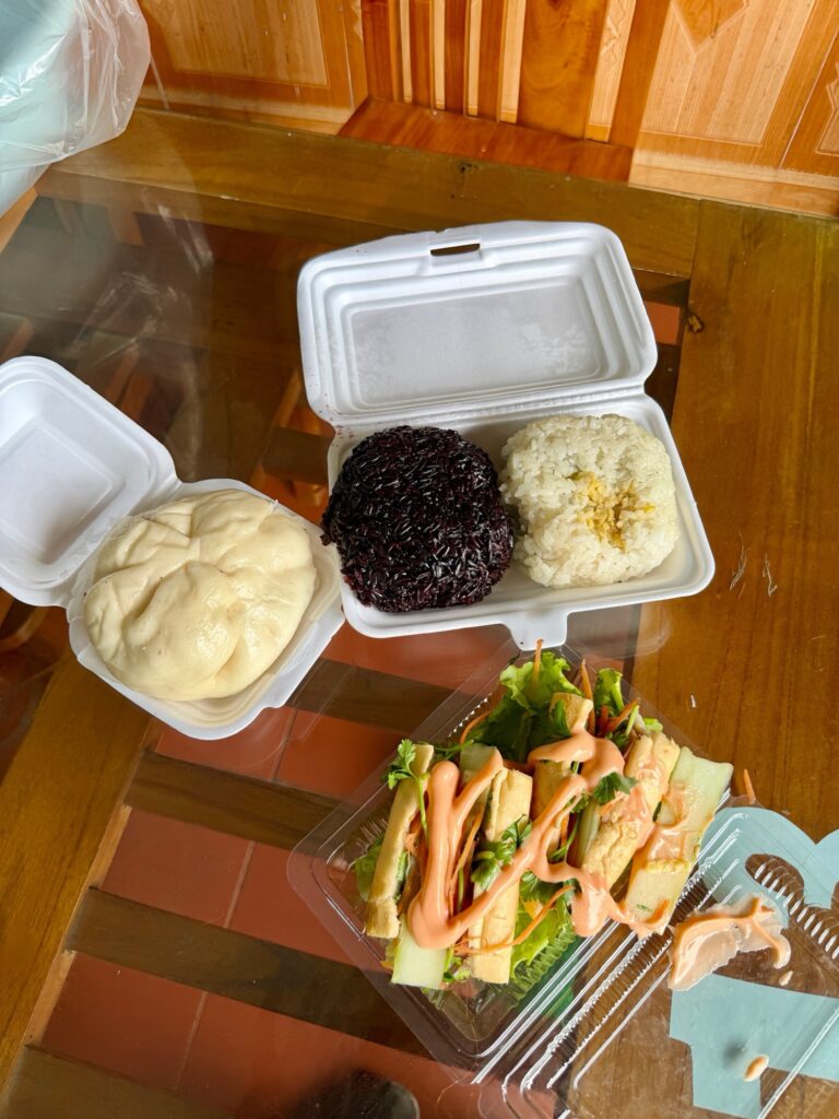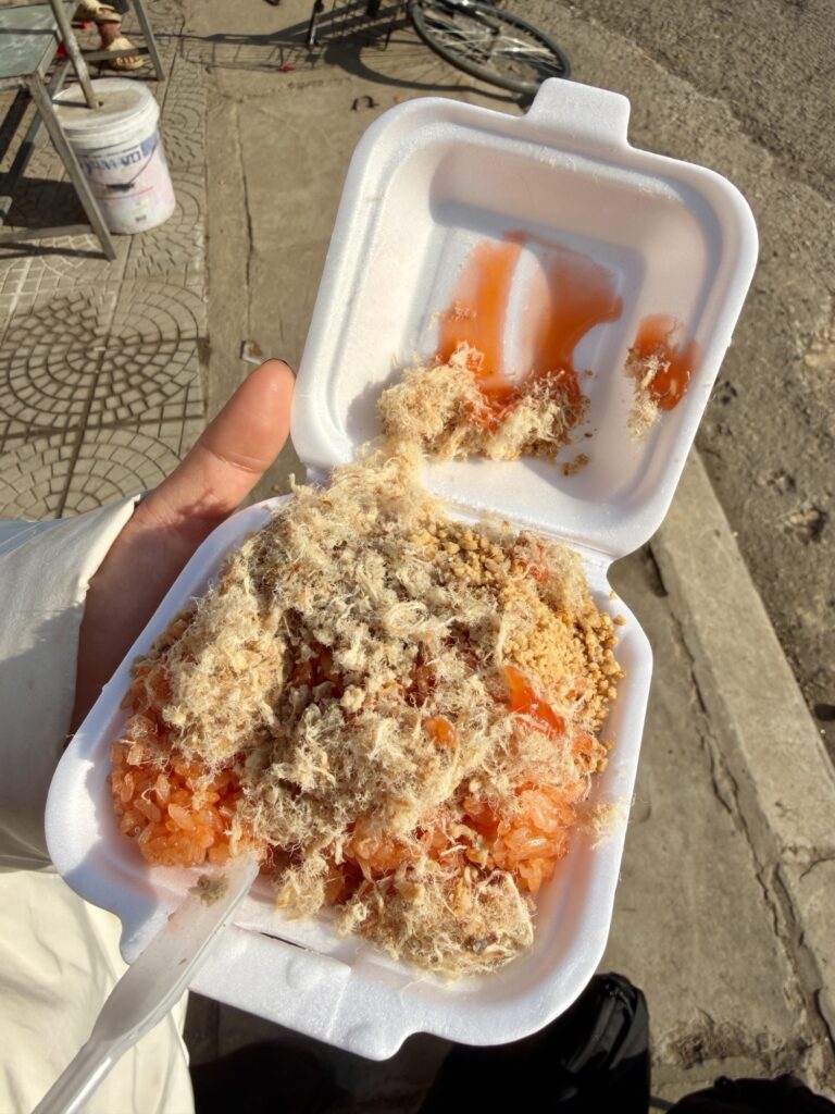おこわはベトナム北部の朝ご飯代表。どこでも食べれます。朝ご飯として食べるのがいいです。朝の屋台に必ずと言ってよいほど沢山ありました。種類はご飯の中に鶏肉や豚肉が入ってるものと、ピーナッツやケチャップ、チャーボン(でんぶ)がかかっているものを食べました。チャーボンはベトナムの定番ふりかけのようなもの、おそらく豚肉でした。鶏や牛、魚、きのこなど様々なでんぷがあるそうです。おこわの米は日本でいうもち米?のような食感で馴染み深くて美味しいです。味もしっかりついてます。お赤飯のような味でした。