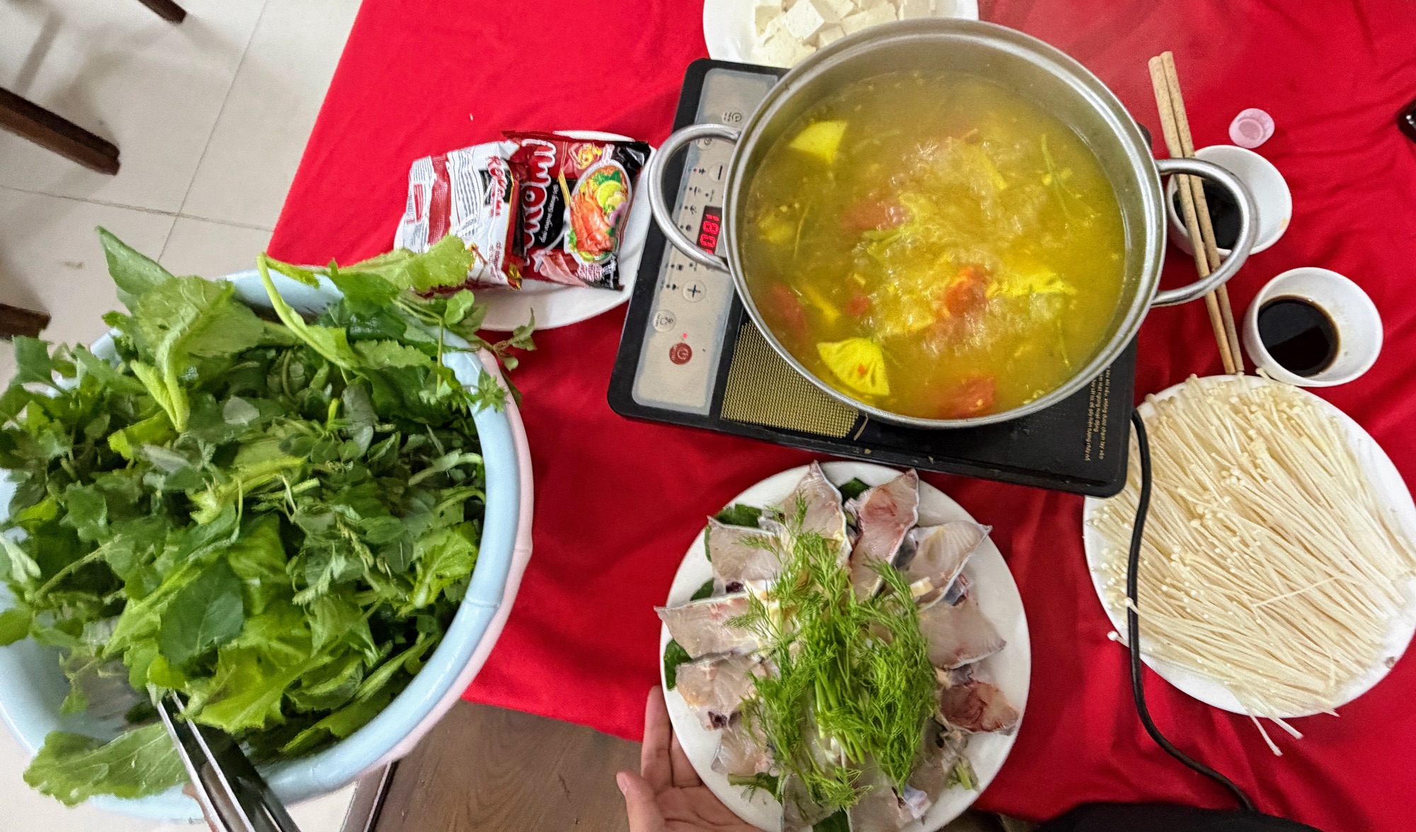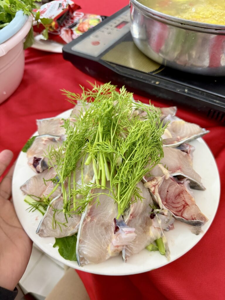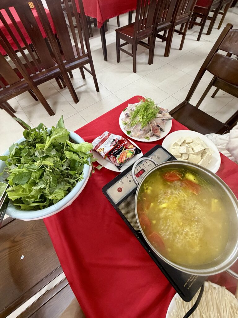 味は白身が分厚くて、やらわらかく食べ応えありの健康的な料理でした。チョウザメはサメという名前がついていますが、淡水魚でサメではないらしいです。チョウザメで1番有名な料理は「キャビア」ですね。スープはエスニックで、酸味が効いておりパイナップルやトマトが入っていてベトナムならではの味です。タレはもちろんヌクマムです。笑 一緒にえのきやパクチー、豆腐、ラーメンがついてきました。